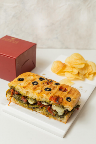 Basil Pesto, Mozzarella, Sundried Tomato & Bell Pepper Focaccia